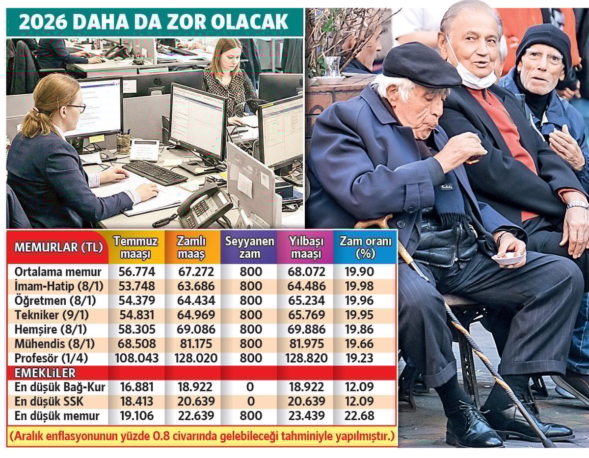 SÖZCÜ’nün yaptığı hesaba göre aralık ayında yüzde 0.8’lik bir enflasyon gelmesi halinde en düşük Bağ-Kur emeklisi maaşı yüzde 12.09 artışla 18 bin 922 lirada kalacak. En düşük SSK emeklisi de aynı oranda zamla yeni yılda 20 bin 639 lira maaş alacak.