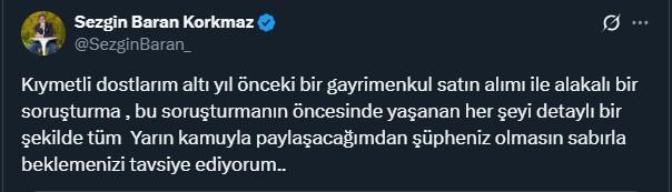 İlk paylaşımında Korkmaz, “Kıymetli dostlarım altı yıl önceki bir gayrimenkul satın alımı ile alakalı bir soruşturma, bu soruşturmanın öncesinde yaşanan her şeyi detaylı bir şekilde tümyarın kamuyla paylaşacağımdan şüpheniz olmasın sabırla beklemenizi tavsiye ediyorum” ifadelerini kullandı.