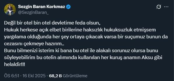 Korkmaz bir diğer paylaşımında “Değil bir otel bin otel devletime feda olsun. Hukuk herkese açık elbet birilerine haksızlık hukuksuzluk etmişsem yargılama olduğunda her şey ortaya çıkacak varsa bir suçumuz bunun da cezasını çekmeye hazırım. Bunu bilmenizi isterim ki bana bu otel ile alakalı sorunuz olursa bunu söyleyebilirim bu otelin alımında kullanılan her kuruş anamın ak sütü gibi helaldir” diye yazdı.