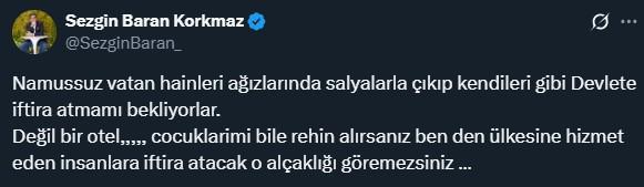 Korkmaz sonraki paylaşımlarında ise şu ifadeleri kullandı: “Namussuz vatan hainleri ağızlarında salyalarla çıkıp kendileri gibi devlete iftira atmamı bekliyorlar. Değil bir otel, çocuklarımı bile rehin alırsanız ben den ülkesine hizmet eden insanlara iftira atacak o alçaklığı göremezsiniz.