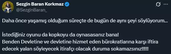 Yaşanan gelişmelerin ardından Sezgin Baran Korkmaz, sosyal medya hesabından açıklamalarda bulundu. Korkmaz yaptığı bir dizi paylaşımda dikkat çeken ifadeler de kullandı.