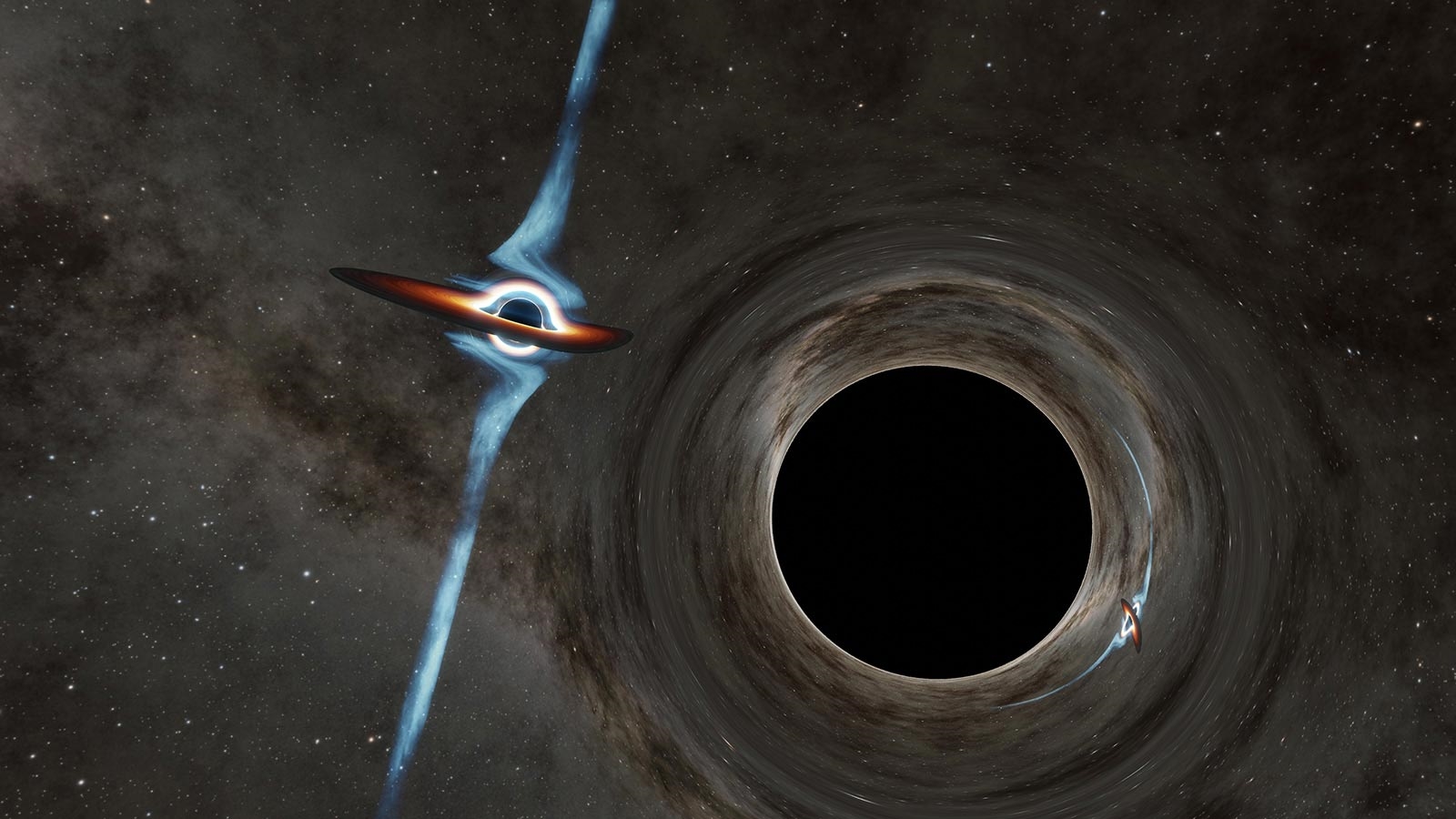 Yaklaşık 5 milyar ışık yılı uzaklıkta bulunan bu iki kara delik, 12 yıllık bir yörüngede birbirlerinin çevresinde dönüyor. Sistemdeki büyük kara delik, evrendeki en parlak gök cisimlerinden biri olan OJ 287 olarak adlandırılıyor ve Güneş’in 18 milyar katı kütleye sahip. Daha küçük olan kara delik ise neredeyse ışık hızında parçacıklar püskürten bir jet üretiyor. Bu jetin yönü zamanla değişiyor ve adeta salınan bir hortum ya da kuyruğunu sallayan bir köpek gibi davranıyor. Küçük kara deliğin kütlesinin de Güneş’in 150 milyon katı olduğu belirtiliyor.