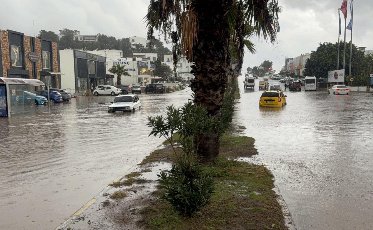Bodrum’da sabah saatlerinde bir anda bastıran sağanak, ilçeyi sular altında bıraktı. Cadde ve sokaklar sel sularıyla dolarken araçlar suyun içinde sürüklenme tehlikesi yaşadı. Sürücüler panikle kapıları açıp dışarı çıkmaya çalıştı, kimi araçlar hareketsiz şekilde yarıya kadar suya gömüldü.